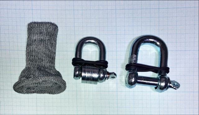シャックルですが、写真中央の呼び9に重りとしてM10のワッシャーを 12枚付けたものと右側の呼び12を使用しています。